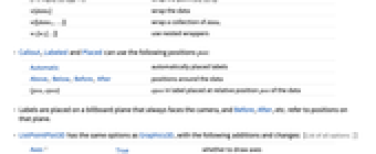 {{…,w[zi,j],…}} wrap the value zi,j in array data {…,w[{xi,yi,zi}],…} wrap the point {xi,yi,zi} w[datai] wrap the data w[{data1,…}] wrap a collection of datai w1[w2[…]] use nested wrappers - Callout, Labeled and Placed can use the following positions pos: