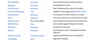 Axes True whether to draw axes BoundaryStyle Automatic how to draw boundary lines for surfaces BoxRatios Automatic bounding 3D box ratios ColorFunction Automatic how to determine the color of the surface ColorFunctionScaling True whether to scale arguments to ColorFunction MaxPlotPoints Automatic the maximum number of points to include Mesh Automatic how many mesh lines in each direction to draw MeshFunctions {#1&,#2&,#3&} how to determine the placement of mesh lines MeshShading None how to shade regions between mesh lines MeshStyle Automatic the style for mesh lines Method Automatic the method to use for interpolation and data reduction PerformanceGoal $PerformanceGoal aspects of performance to try to optimize PlotLegends None legends for surfaces PlotRange All the range of values to include PlotRangePadding Automatic how much to pad the range of values PlotStyle Automatic graphics directives to specify the style for the surface PlotTheme $PlotTheme overall theme for the plot RegionFunction (True&) how to determine whether a point should be included ScalingFunctions None how to scale individual coordinates TextureCoordinateFunction Automatic how to determine texture coordinates TextureCoordinateScaling True whether to scale arguments to TextureCoordinateFunction - ListSurfacePlot3D yields a surface that fits the data provided, but may not necessarily contain the specific points defined by the data.