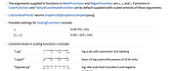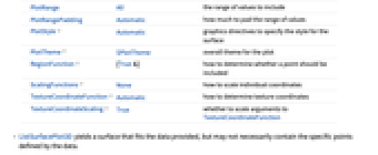 AlignmentPoint Center the default point in the graphic to align with AspectRatio Automatic ratio of height to width Axes True whether to draw axes AxesEdge Automatic on which edges to put axes AxesLabel None axes labels AxesOrigin Automatic where axes should cross AxesStyle {} graphics directives to specify the style for axes Background None background color for the plot BaselinePosition Automatic how to align with a surrounding text baseline BaseStyle {} base style specifications for the graphic BoundaryStyle Automatic how to draw boundary lines for surfaces Boxed True whether to draw the bounding box BoxRatios Automatic bounding 3D box ratios BoxStyle {} style specifications for the box ClipPlanes None clipping planes ClipPlanesStyle Automatic style specifications for clipping planes ColorFunction Automatic how to determine the color of the surface ColorFunctionScaling True whether to scale arguments to ColorFunction ContentSelectable Automatic whether to allow contents to be selected ControllerLinking False when to link to external rotation controllers ControllerPath Automatic what external controllers to try to use Epilog {} 2D graphics primitives to be rendered after the main plot FaceGrids None grid lines to draw on the bounding box FaceGridsStyle {} style specifications for face grids FormatType TraditionalForm default format type for text ImageMargins 0. the margins to leave around the graphic ImagePadding All what extra padding to allow for labels, etc. ImageSize Automatic absolute size at which to render the graphic LabelStyle {} style specifications for labels Lighting Automatic simulated light sources to use MaxPlotPoints Automatic the maximum number of points to include Mesh Automatic how many mesh lines in each direction to draw MeshFunctions {#1&,#2&,#3&} how to determine the placement of mesh lines MeshShading None how to shade regions between mesh lines MeshStyle Automatic the style for mesh lines Method Automatic the method to use for interpolation and data reduction PerformanceGoal $PerformanceGoal aspects of performance to try to optimize PlotLabel None a label for the plot PlotLegends None legends for surfaces PlotRange All the range of values to include PlotRangePadding Automatic how much to pad the range of values PlotRegion Automatic final display region to be filled PlotStyle Automatic graphics directives to specify the style for the surface PlotTheme $PlotTheme overall theme for the plot PreserveImageOptions Automatic whether to preserve image options when displaying new versions of the same graphic Prolog {} 2D graphics primitives to be rendered before the main plot RegionFunction (True&) how to determine whether a point should be included RotationAction "Fit" how to render after interactive rotation ScalingFunctions None how to scale individual coordinates SphericalRegion Automatic whether to make the circumscribing sphere fit in the final display area TextureCoordinateFunction Automatic how to determine texture coordinates TextureCoordinateScaling True whether to scale arguments to TextureCoordinateFunction Ticks Automatic specification for ticks TicksStyle {} style specification for ticks TouchscreenAutoZoom False whether to zoom to fullscreen when activated on a touchscreen ViewAngle Automatic angle of the field of view ViewCenter Automatic point to display at the center ViewMatrix Automatic explicit transformation matrix ViewPoint {1.3,-2.4,2.} viewing position ViewProjection Automatic projection method for rendering objects distant from the viewer ViewRange All range of viewing distances to include ViewVector Automatic position and direction of a simulated camera ViewVertical {0,0,1} direction to make vertical