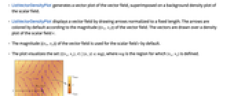 - ListVectorDensityPlot generates a vector plot of the vector field, superimposed on a background density plot of the scalar field.