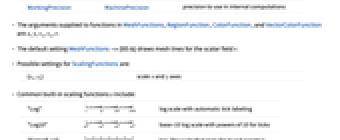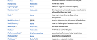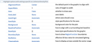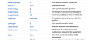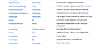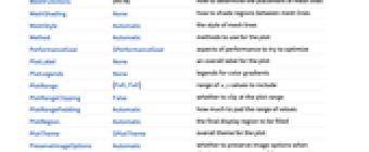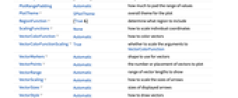 AlignmentPoint Center the default point in the graphic to align with AspectRatio 1 ratio of height to width Axes False whether to draw axes AxesLabel None axes labels AxesOrigin Automatic where axes should cross AxesStyle {} style specifications for the axes Background None background color for the plot BaselinePosition Automatic how to align with a surrounding text baseline BaseStyle {} base style specifications for the graphic BoundaryStyle None how to draw RegionFunction boundaries BoxRatios Automatic effective 3D box ratios for simulated lighting ClippingStyle Automatic how to display arrows outside the vector range ColorFunction Automatic how to color background densities ColorFunctionScaling True whether to scale arguments to ColorFunction ContentSelectable Automatic whether to allow contents to be selected CoordinatesToolOptions Automatic detailed behavior of the coordinates tool DataRange Automatic the range of x and y values to assume for data Epilog {} primitives rendered after the main plot EvaluationMonitor None expression to evaluate at every function evaluation FormatType TraditionalForm the default format type for text Frame True whether to draw a frame around the plot FrameLabel None frame labels FrameStyle {} style specifications for the frame FrameTicks Automatic frame tick marks FrameTicksStyle {} style specifications for frame ticks GridLines None grid lines to draw GridLinesStyle {} style specifications for grid lines ImageMargins 0. the margins to leave around the graphic ImagePadding All what extra padding to allow for labels etc. ImageSize Automatic the absolute size at which to render the graphic LabelStyle {} style specifications for labels LightingAngle None effective angle for simulated lighting MaxRecursion Automatic the maximum number of recursive subdivisions allowed for the scalar field Mesh None how many mesh lines to draw in the background MeshFunctions {#5&} how to determine the placement of mesh lines MeshShading None how to shade regions between mesh lines MeshStyle Automatic the style of mesh lines Method Automatic methods to use for the plot PerformanceGoal $PerformanceGoal aspects of performance to try to optimize PlotLabel None an overall label for the plot PlotLegends None legends for color gradients PlotRange {Full,Full} range of x, y values to include PlotRangeClipping False whether to clip at the plot range PlotRangePadding Automatic how much to pad the range of values PlotRegion Automatic the final display region to be filled PlotTheme $PlotTheme overall theme for the plot PreserveImageOptions Automatic whether to preserve image options when displaying new versions of the same graphic Prolog {} primitives rendered before the main plot RegionFunction (True&) determine what region to include RotateLabel True whether to rotate y labels on the frame ScalingFunctions None how to scale individual coordinates Ticks Automatic axes ticks TicksStyle {} style specifications for axes ticks VectorColorFunction Automatic how to color vectors VectorColorFunctionScaling True whether to scale the arguments to VectorColorFunction VectorMarkers Automatic shape to use for vectors VectorPoints Automatic the number or placement of vectors to plot VectorRange Automatic range of vector lengths to show VectorScaling Automatic how to scale the sizes of arrows VectorSizes Automatic sizes of displayed arrows VectorStyle Automatic how to draw vectors WorkingPrecision MachinePrecision precision to use in internal computations