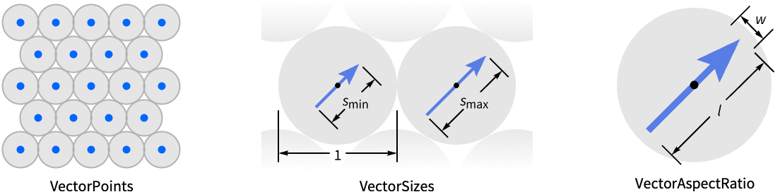 - VectorScaling scales the magnitudes of the vectors into the range of arrow sizes smin to smax given by VectorSizes.