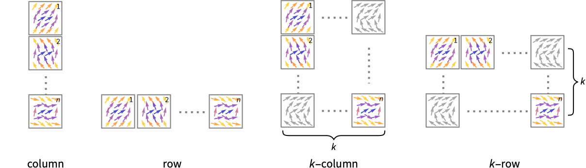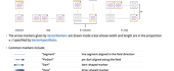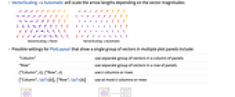 "Column" use separate group of vectors in a column of panels "Row" use separate group of vectors in a row of panels {"Column",k},{"Row",k} use k columns or rows {"Column",UpTo[k]},{"Row",UpTo[k]} use at most k columns or rows - The arrow markers given by VectorMarkers are drawn inside a box whose width and length are in the proportion