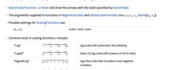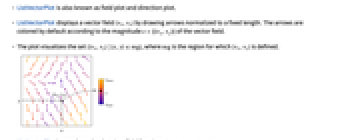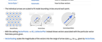 AspectRatio 1 ratio of height to width ClippingStyle Automatic how to display arrows outside the vector range DataRange Automatic the range of x and y values to assume for data Frame True whether to draw a frame around the plot FrameTicks Automatic frame tick marks Method Automatic methods to use for the plot PerformanceGoal $PerformanceGoal aspects of performance to try to optimize PlotLayout Automatic how to position fields PlotLegends None legends for vector fields PlotRange {Full,Full} range of x, y values to include PlotRangePadding Automatic how much to pad the range of values PlotTheme $PlotTheme overall theme for the plot RegionFunction (True&) determine what region to include RegionBoundaryStyle Automatic how to style plot region boundaries RegionFillingStyle Automatic how to style plot region interiors ScalingFunctions None how to scale individual coordinates VectorAspectRatio Automatic width to length ratio for arrows VectorColorFunction Automatic how to color arrows VectorColorFunctionScaling True whether to scale the argument to VectorColorFunction VectorMarkers Automatic shape to use for arrows VectorPoints Automatic the number or placement of arrows VectorRange Automatic range of vector lengths to show VectorScaling None how to scale the sizes of arrows VectorSizes Automatic sizes of displayed arrows VectorStyle Automatic how to draw vectors - The individual arrows are scaled to fit inside bounding circles around each point.