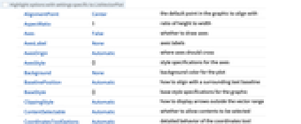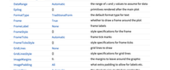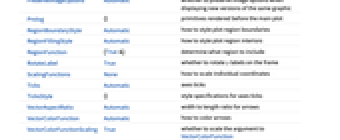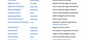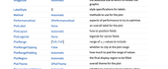 AlignmentPoint Center the default point in the graphic to align with AspectRatio 1 ratio of height to width Axes False whether to draw axes AxesLabel None axes labels AxesOrigin Automatic where axes should cross AxesStyle {} style specifications for the axes Background None background color for the plot BaselinePosition Automatic how to align with a surrounding text baseline BaseStyle {} base style specifications for the graphic ClippingStyle Automatic how to display arrows outside the vector range ContentSelectable Automatic whether to allow contents to be selected CoordinatesToolOptions Automatic detailed behavior of the coordinates tool DataRange Automatic the range of x and y values to assume for data Epilog {} primitives rendered after the main plot FormatType TraditionalForm the default format type for text Frame True whether to draw a frame around the plot FrameLabel None frame labels FrameStyle {} style specifications for the frame FrameTicks Automatic frame tick marks FrameTicksStyle {} style specifications for frame ticks GridLines None grid lines to draw GridLinesStyle {} style specifications for grid lines ImageMargins 0. the margins to leave around the graphic ImagePadding All what extra padding to allow for labels etc. ImageSize Automatic the absolute size at which to render the graphic LabelStyle {} style specifications for labels Method Automatic methods to use for the plot PerformanceGoal $PerformanceGoal aspects of performance to try to optimize PlotLabel None an overall label for the plot PlotLayout Automatic how to position fields PlotLegends None legends for vector fields PlotRange {Full,Full} range of x, y values to include PlotRangeClipping False whether to clip at the plot range PlotRangePadding Automatic how much to pad the range of values PlotRegion Automatic the final display region to be filled PlotTheme $PlotTheme overall theme for the plot PreserveImageOptions Automatic whether to preserve image options when displaying new versions of the same graphic Prolog {} primitives rendered before the main plot RegionBoundaryStyle Automatic how to style plot region boundaries RegionFillingStyle Automatic how to style plot region interiors RegionFunction (True&) determine what region to include RotateLabel True whether to rotate y labels on the frame ScalingFunctions None how to scale individual coordinates Ticks Automatic axes ticks TicksStyle {} style specifications for axes ticks VectorAspectRatio Automatic width to length ratio for arrows VectorColorFunction Automatic how to color arrows VectorColorFunctionScaling True whether to scale the argument to VectorColorFunction VectorMarkers Automatic shape to use for arrows VectorPoints Automatic the number or placement of arrows VectorRange Automatic range of vector lengths to show VectorScaling None how to scale the sizes of arrows VectorSizes Automatic sizes of displayed arrows VectorStyle Automatic how to draw vectors