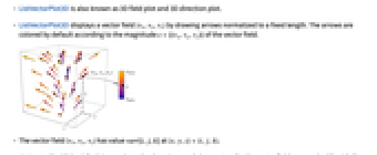 - ListVectorPlot3D is also known as 3D field plot and 3D direction plot.