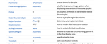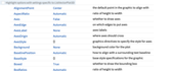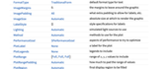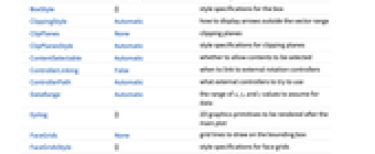 AlignmentPoint Center the default point in the graphic to align with AspectRatio Automatic ratio of height to width Axes False whether to draw axes AxesEdge Automatic on which edges to put axes AxesLabel None axes labels AxesOrigin Automatic where axes should cross AxesStyle {} graphics directives to specify the style for axes Background None background color for the plot BaselinePosition Automatic how to align with a surrounding text baseline BaseStyle {} base style specifications for the graphic Boxed True whether to draw the bounding box BoxRatios Automatic ratio of height to width BoxStyle {} style specifications for the box ClippingStyle Automatic how to display arrows outside the vector range ClipPlanes None clipping planes ClipPlanesStyle Automatic style specifications for clipping planes ContentSelectable Automatic whether to allow contents to be selected ControllerLinking False when to link to external rotation controllers ControllerPath Automatic what external controllers to try to use DataRange Automatic the range of x, y, and z values to assume for data Epilog {} 2D graphics primitives to be rendered after the main plot FaceGrids None grid lines to draw on the bounding box FaceGridsStyle {} style specifications for face grids FormatType TraditionalForm default format type for text ImageMargins 0. the margins to leave around the graphic ImagePadding All what extra padding to allow for labels, etc. ImageSize Automatic absolute size at which to render the graphic LabelStyle {} style specifications for labels Lighting Automatic simulated light sources to use Method Automatic methods to use for the plot PerformanceGoal $PerformanceGoal aspects of performance to try to optimize PlotLabel None a label for the plot PlotLegends None legends to include PlotRange {Full,Full,Full} range of x, y, z values to include PlotRangePadding Automatic how much to pad the range of values PlotRegion Automatic final display region to be filled PlotTheme $PlotTheme overall theme for the plot PreserveImageOptions Automatic whether to preserve image options when displaying new versions of the same graphic Prolog {} 2D graphics primitives to be rendered before the main plot RegionBoundaryStyle Automatic how to style plot region boundaries RegionFunction (True&) determine what region to include RotationAction "Fit" how to render after interactive rotation ScalingFunctions None how to scale individual coordinates SphericalRegion Automatic whether to make the circumscribing sphere fit in the final display area Ticks Automatic specification for ticks TicksStyle {} style specification for ticks TouchscreenAutoZoom False whether to zoom to fullscreen when activated on a touchscreen VectorAspectRatio Automatic width-to-length ratio for arrows VectorColorFunction Automatic how to color vectors VectorColorFunctionScaling True whether to scale the argument to VectorColorFunction VectorPoints Automatic the number or placement of arrows VectorRange Automatic range of vector lengths to show VectorScaling None how to scale the sizes of arrows VectorSizes Automatic sizes of displayed arrows VectorStyle Automatic how to draw arrows ViewAngle Automatic angle of the field of view ViewCenter Automatic point to display at the center ViewMatrix Automatic explicit transformation matrix ViewPoint {1.3,-2.4,2.} viewing position ViewProjection Automatic projection method for rendering objects distant from the viewer ViewRange All range of viewing distances to include ViewVector Automatic position and direction of a simulated camera ViewVertical {0,0,1} direction to make vertical