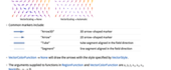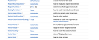 BoxRatios Automatic ratio of height to width ClippingStyle Automatic how to display arrows outside the vector range DataRange Automatic the range of x, y, and z values to assume for data Method Automatic methods to use for the plot PerformanceGoal $PerformanceGoal aspects of performance to try to optimize PlotLegends None legends to include PlotRange {Full,Full,Full} range of x, y, z values to include PlotRangePadding Automatic how much to pad the range of values PlotTheme $PlotTheme overall theme for the plot RegionBoundaryStyle Automatic how to style plot region boundaries RegionFunction (True&) determine what region to include ScalingFunctions None how to scale individual coordinates VectorAspectRatio Automatic width-to-length ratio for arrows VectorColorFunction Automatic how to color vectors VectorColorFunctionScaling True whether to scale the argument to VectorColorFunction VectorPoints Automatic the number or placement of arrows VectorRange Automatic range of vector lengths to show VectorScaling None how to scale the sizes of arrows VectorSizes Automatic sizes of displayed arrows VectorStyle Automatic how to draw arrows - With the setting VectorPointsAll, ListVectorPlot3D instead shows vectors associated with the particular vector field data points given.