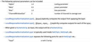 "Alpha" 1.0 scaling parameter "Beta" 0.5 power parameter "Bias" 1.0 bias parameter "ChannelWindowSize" 2 number of channels to average over - LocalResponseNormalizationLayer[…][input] explicitly computes the output from applying the layer.