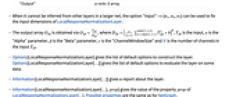 "Input" a rank-3 array "Output" a rank-3 array - When it cannot be inferred from other layers in a larger net, the option "Input"->{n1,n2,n3} can be used to fix the input dimensions of LocalResponseNormalizationLayer.