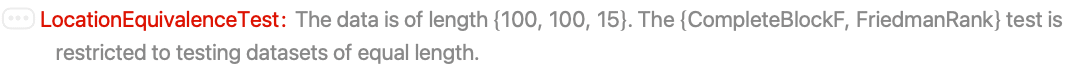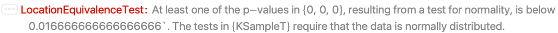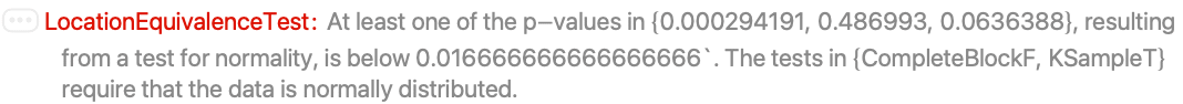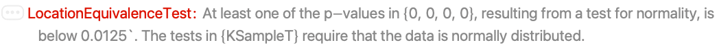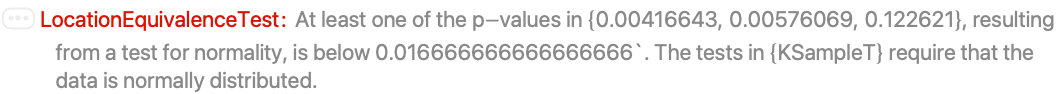 -test is equivalent to a one-way analysis of variance of the data. - LocationEquivalenceTest[{data1,…},"HypothesisTestData"] returns a HypothesisTestData object htd that can be used to extract additional test results and properties using the form htd["property"].