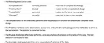 "CompleteBlockF" normality, blocked mean test for complete block design "FriedmanRank" blocked median test for complete block design "KruskalWallis" symmetry median test for two or more samples "KSampleT" normality mean test for two or more samples - The complete block