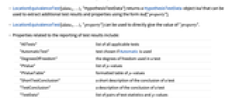 "AllTests" list of all applicable tests "AutomaticTest" test chosen if Automatic is used "DegreesOfFreedom" the degrees of freedom used in a test "PValue" list of