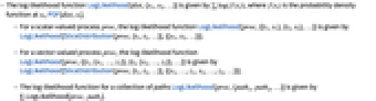 is the probability density function at xi, PDF[dist,xi]. - For a scalar‐valued process proc, the log-likelihood function LogLikelihood[proc,{{t1,x1},{t2,x2},…}] is given by LogLikelihood[SliceDistribution[proc,{t1,t2,…}],{{x1,x2,…}}].