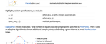x, {x} effect at {x,y} with y chosen automatically {x,y} effect at {x,y} {pos1,pos2,…} multiple positions posi - LogLogPlot initially evaluates f at a number of equally spaced sample points specified by PlotPoints. Then it uses an adaptive algorithm to choose additional sample points, subdividing a given interval at most MaxRecursion times.
