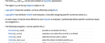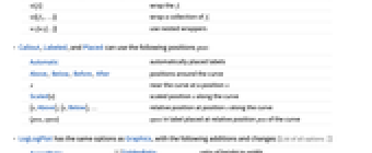 Automatic automatically placed labels Above, Below, Before, After positions around the curve x near the curve at a position x Scaled[s] scaled position s along the curve {s,Above},{s,Below},… relative position at position s along the curve {pos,epos} epos in label placed at relative position pos of the curve - LogLogPlot has the same options as Graphics, with the following additions and changes: [List of all options]