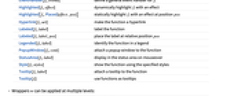 Annotation[fi,label] provide an annotation for the fi Button[fi,action] evaluate action when the curve for fi is clicked Callout[fi,label] label the function with a callout Callout[fi,label,pos] place the callout at relative position pos EventHandler[fi,events] define a general event handler for fi Highlighted[fi,effect] dynamically highlight fi with an effect Highlighted[fi,Placed[effect,pos]] statically highlight fi with an effect at position pos Hyperlink[fi,uri] make the function a hyperlink Labeled[fi,label] label the function Labeled[fi,label,pos] place the label at relative position pos Legended[fi,label] identify the function in a legend PopupWindow[fi,cont] attach a popup window to the function StatusArea[fi,label] display in the status area on mouseover Style[fi,styles] show the function using the specified styles Tooltip[fi,label] attach a tooltip to the function Tooltip[fi] use functions as tooltips - Wrappers w can be applied at multiple levels: