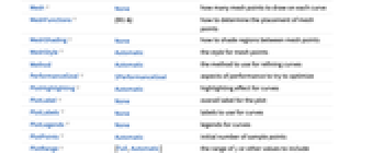 AlignmentPoint Center the default point in the graphic to align with AspectRatio 1/GoldenRatio ratio of height to width Axes True whether to draw axes AxesLabel None axes labels AxesOrigin Automatic where axes should cross AxesStyle {} style specifications for the axes Background None background color for the plot BaselinePosition Automatic how to align with a surrounding text baseline BaseStyle {} base style specifications for the graphic ClippingStyle None what to draw where curves are clipped ColorFunction Automatic how to determine the coloring of curves ColorFunctionScaling True whether to scale arguments to ColorFunction ContentSelectable Automatic whether to allow contents to be selected CoordinatesToolOptions Automatic detailed behavior of the coordinates tool Epilog {} primitives rendered after the main plot EvaluationMonitor None expression to evaluate at every function evaluation Exclusions Automatic points in x to exclude ExclusionsStyle None what to draw at excluded points Filling None filling to insert under each curve FillingStyle Automatic style to use for filling FormatType TraditionalForm the default format type for text Frame False whether to put a frame around the plot FrameLabel None frame labels FrameStyle {} style specifications for the frame FrameTicks Automatic frame ticks FrameTicksStyle {} style specifications for frame ticks GridLines None grid lines to draw GridLinesStyle {} style specifications for grid lines ImageMargins 0. the margins to leave around the graphic ImagePadding All what extra padding to allow for labels etc. ImageSize Automatic the absolute size at which to render the graphic LabelingSize Automatic maximum size of callouts and labels LabelStyle {} style specifications for labels MaxRecursion Automatic the maximum number of recursive subdivisions allowed Mesh None how many mesh points to draw on each curve MeshFunctions {#1&} how to determine the placement of mesh points MeshShading None how to shade regions between mesh points MeshStyle Automatic the style for mesh points Method Automatic the method to use for refining curves PerformanceGoal $PerformanceGoal aspects of performance to try to optimize PlotHighlighting Automatic highlighting effect for curves PlotInteractivity $PlotInteractivity whether to allow interactive elements PlotLabel None overall label for the plot PlotLabels None labels to use for curves PlotLegends None legends for curves PlotPoints Automatic initial number of sample points PlotRange {Full,Automatic} the range of y or other values to include PlotRangeClipping True whether to clip at the plot range PlotRangePadding Automatic how much to pad the range of values PlotRegion Automatic the final display region to be filled PlotStyle Automatic graphics directives to specify the style for each curve PlotTheme $PlotTheme overall theme for the plot PreserveImageOptions Automatic whether to preserve image options when displaying new versions of the same graphic Prolog {} primitives rendered before the main plot RegionFunction (True&) how to determine whether a point should be included RotateLabel True whether to rotate y labels on the frame ScalingFunctions None how to scale individual coordinates TargetUnits Automatic units to display in the plot Ticks Automatic axes ticks TicksStyle {} style specifications for axes ticks WorkingPrecision MachinePrecision the precision used in internal computations