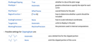 AspectRatio 1/GoldenRatio ratio of height to width Axes True whether to draw axes ClippingStyle None what to draw where curves are clipped ColorFunction Automatic how to determine the coloring of curves ColorFunctionScaling True whether to scale arguments to ColorFunction EvaluationMonitor None expression to evaluate at every function evaluation Exclusions Automatic points in x to exclude ExclusionsStyle None what to draw at excluded points Filling None filling to insert under each curve FillingStyle Automatic style to use for filling LabelingSize Automatic maximum size of callouts and labels MaxRecursion Automatic the maximum number of recursive subdivisions allowed Mesh None how many mesh points to draw on each curve MeshFunctions {#1&} how to determine the placement of mesh points MeshShading None how to shade regions between mesh points MeshStyle Automatic the style for mesh points Method Automatic the method to use for refining curves PerformanceGoal $PerformanceGoal aspects of performance to try to optimize PlotHighlighting Automatic highlighting effect for curves PlotInteractivity $PlotInteractivity whether to allow interactive elements PlotLabel None overall label for the plot PlotLabels None labels to use for curves PlotLegends None legends for curves PlotPoints Automatic initial number of sample points PlotRange {Full,Automatic} the range of y or other values to include PlotRangeClipping True whether to clip at the plot range PlotStyle Automatic graphics directives to specify the style for each curve PlotTheme $PlotTheme overall theme for the plot RegionFunction (True&) how to determine whether a point should be included ScalingFunctions None how to scale individual coordinates TargetUnits Automatic units to display in the plot WorkingPrecision MachinePrecision the precision used in internal computations - Possible settings for ClippingStyle are: