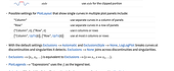 "Column" use separate curves in a column of panels "Row" use separate curves in a row of panels {"Column",k},{"Row",k} use k columns or rows {"Column",UpTo[k]},{"Row",UpTo[k]} use at most k columns or rows - With the default settings Exclusions->Automatic and ExclusionsStyle->None, LogLogPlot breaks curves at discontinuities and singularities it detects. Exclusions->None joins across discontinuities and singularities.