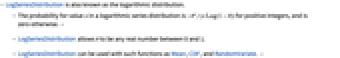 - LogSeriesDistribution[θ] represents a discrete statistical distribution defined for integer values