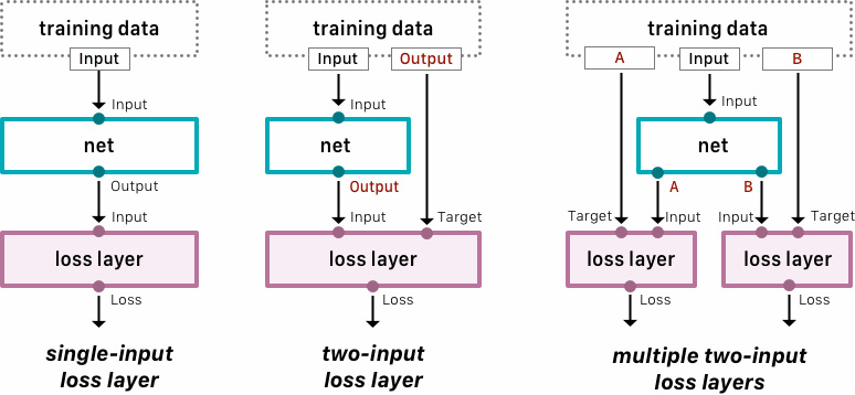- If the attached loss layer has one input port ("Input"), it will be attached to the output of the net, and the keys of the training data should supply ports to feed the input of the net only (see figure below, left side).