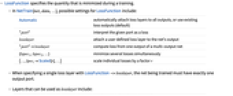 Automatic automatically attach loss layers to all outputs, or use existing loss outputs (default) "port" interpret the given port as a loss losslayer attach a user defined loss layer to the net's output "port"losslayer compute loss from one output of a multi-output net {lspec1,lspec2,…} minimize several losses simultaneously {…,lpeciScaled[r],…} scale individual losses by a factor r - When specifying a single loss layer with LossFunction->losslayer, the net being trained must have exactly one output port.