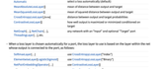 Automatic select a loss automatically (default) MeanAbsoluteLossLayer[] mean of distance between output and target MeanSquaredLossLayer[] mean of squared distance between output and target CrossEntropyLossLayer[form] distance between output and target probabilities ContrastiveLossLayer[] how well output is maximized or minimized conditioned on target NetGraph[…], NetChain[…], ThreadingLayer[…], etc. any network with an "Input" and optional "Target" port - When a loss layer is chosen automatically for a port, the loss layer to use is based on the layer within the net whose output is connected to the port, as follows:
