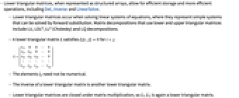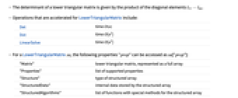 - Lower triangular matrices, when represented as structured arrays, allow for efficient storage and more efficient operations, including Det, Inverse and LinearSolve.