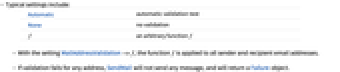 Automatic automatic validation test None no validation f an arbitrary function f - With the setting MailAddressValidation->f, the function f is applied to all sender and recipient email addresses.