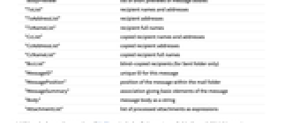 "Flags" flags set for this message "Tags" user-defined tags set for this message "Folder" folder containing this message "OriginatingDate" date and time from message headers "OriginatingTimeZone" time zone from message headers "From" sender name and email address "FromAddress" sender raw email address "Subject" the subject of the email "BodyPreview" list of short previews of message bodies "ToList" recipient names and addresses "ToAddressList" recipient addresses "ToNameList" recipient full names "CcList" copied recipient names and addresses "CcAddressList" copied recipient addresses "CcNameList" copied recipient full names "BccList" blind-copied recipients (for Sent folder only) "MessageID" unique ID for this message "MessagePosition" position of the message within the mail folder "MessageSummary" association giving basic elements of the message "Body" message body as a string "AttachmentList" list of processed attachments as expressions - Additional advanced properties of MailItem include all elements available through "EML" import.