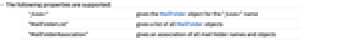 "folder" gives the MailFolder object for the "folder" name "MailFolderList" gives a list of all MailFolder objects "MailFolderAssociation" gives an association of all mail folder names and objects