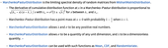 - MarchenkoPasturDistribution is the limiting spectral density of random matrices from WishartMatrixDistribution.