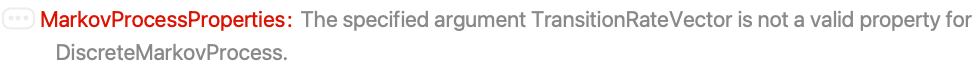 "InitialProbabilities" initial state probability vector "TransitionMatrix" conditional transition probabilities m "TransitionRateMatrix" conditional transition rates q "TransitionRateVector" state transition rates μ "HoldingTimeMean" mean holding time for a state "HoldingTimeVariance" variance of holding time for a state "SummaryTable" summary of properties - For a continuous-time Markov process "TransitionMatrix" gives the transition matrix of the embedded discrete-time Markov process.