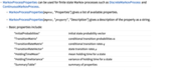 - MarkovProcessProperties can be used for finite state Markov processes such as DiscreteMarkovProcess and ContinuousMarkovProcess.