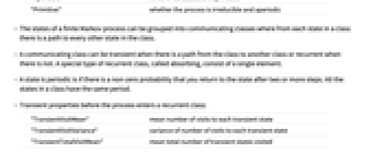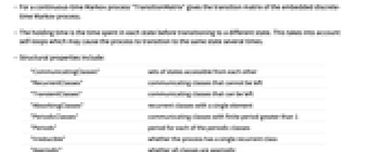 "CommunicatingClasses" sets of states accessible from each other "RecurrentClasses" communicating classes that cannot be left "TransientClasses" communicating classes that can be left "AbsorbingClasses" recurrent classes with a single element "PeriodicClasses" communicating classes with finite period greater than 1 "Periods" period for each of the periodic classes "Irreducible" whether the process has a single recurrent class "Aperiodic" whether all classes are aperiodic "Primitive" whether the process is irreducible and aperiodic - The states of a finite Markov process can be grouped into communicating classes where from each state in a class there is a path to every other state in the class.