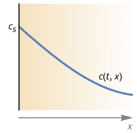 Model a 1D chemical species field in an incompressible fluid whose right side and left side are subjected to a mass concentration and inflow condition, respectively: