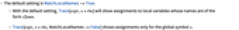 - With the default setting, Trace[expr,x=rhs] will show assignments to local variables whose names are of the form x$nnn.