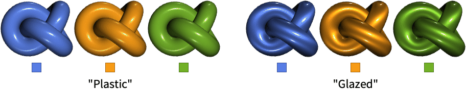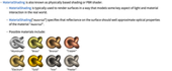 - MaterialShading["material"] specifies that reflectance on the surface should well approximate optical properties of the material "material".