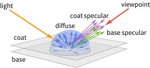Texture[image] a 2D texture based on an image {…,s} fraction of surface normals - Possible parameters parmi of the clear coat covering of the material include: