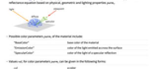 "BaseColor" base color of the material "EmissionColor" color of the light emitted accross the surface "SpecularColor" color of the light of a specular reflection - Values vali for color parameters parmi can be given in the following forms: