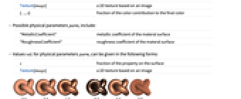 col a color Texture[image] a 2D texture based on an image {…,s} fraction of the color contribution to the final color - Possible physical parameters parmi include: