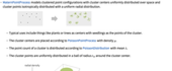 - MaternPointProcess models clustered point configurations with cluster centers uniformly distributed over space and cluster points isotropically distributed with a uniform radial distribution.