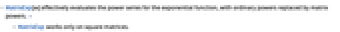 Wolfram Language. 1991. "MatrixExp." Wolfram Language & System Documentation Center. Wolfram Research. Last Modified 2024. https://reference.wolfram.com/language/ref/MatrixExp.html.