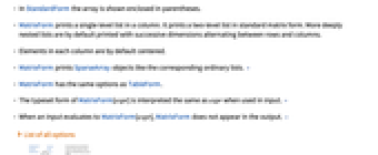 - MatrixForm prints a single‐level list in a column. It prints a two‐level list in standard matrix form. More deeply nested lists are by default printed with successive dimensions alternating between rows and columns.