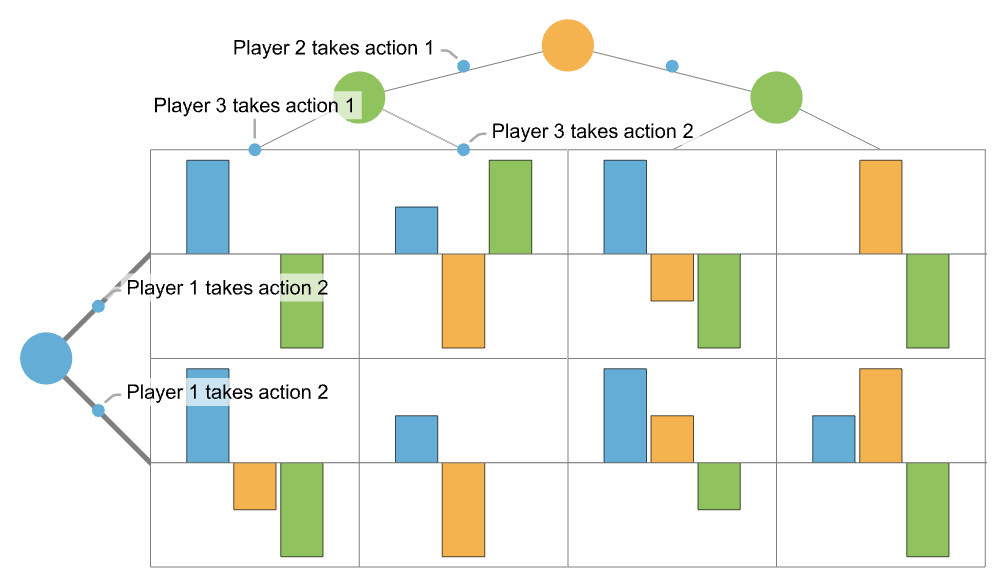 - When there are multiple players on rows or columns, a row or column is used for each combination for player actions: