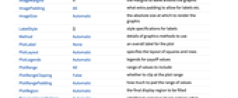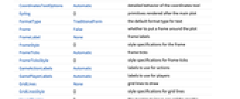 AlignmentPoint Center the default point in the graphic to align with AspectRatio Automatic ratio of height to width Axes False whether to draw axes AxesLabel None axes labels AxesOrigin Automatic where axes should cross AxesStyle {} style specifications for the axes Background None background color for the plot BaselinePosition Automatic how to align with a surrounding text baseline BaseStyle {} base style specifications for the graphic ColorFunction Automatic how to color payoffs for each player ColorFunctionScaling False whether to scale arguments to ColorFunction ContentSelectable Automatic whether to allow contents to be selected CoordinatesToolOptions Automatic detailed behavior of the coordinates tool Epilog {} primitives rendered after the main plot FormatType TraditionalForm the default format type for text Frame False whether to put a frame around the plot FrameLabel None frame labels FrameStyle {} style specifications for the frame FrameTicks Automatic frame ticks FrameTicksStyle {} style specifications for frame ticks GameActionLabels Automatic labels to use for actions GamePlayerLabels Automatic labels to use for players GridLines None grid lines to draw GridLinesStyle {} style specifications for grid lines ImageMargins 0. the margins to leave around the graphic ImagePadding All what extra padding to allow for labels etc. ImageSize Automatic the absolute size at which to render the graphic LabelStyle {} style specifications for labels Method Automatic details of graphics methods to use PlotLabel None an overall label for the plot PlotLayout Automatic specifies the layout of squares and rows PlotLegends Automatic legends for payoff values PlotRange All range of values to include PlotRangeClipping False whether to clip at the plot range PlotRangePadding Automatic how much to pad the range of values PlotRegion Automatic the final display region to be filled PreserveImageOptions Automatic whether to preserve image options when displaying new versions of the same graphic Prolog {} primitives rendered before the main plot RotateLabel True whether to rotate y labels on the frame Ticks Automatic axes ticks TicksStyle {} style specifications for axes ticks