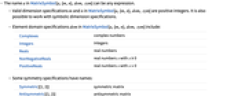 - Element domain specifications dom in MatrixSymbol[a,{m,n},dom, sym] include: