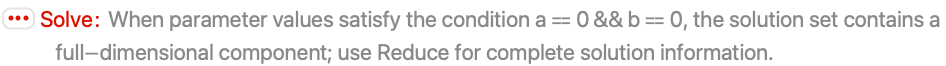 - Solve gives generic solutions only. Solutions that are valid only when continuous parameters satisfy equations are removed. Additional solutions can be obtained by using nondefault settings for MaxExtraConditions.