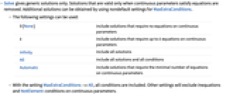 0 (None) include solutions that require no equations on continuous parameters k include solutions that require up to k equations on continuous parameters Infinity include all solutions All include all solutions and all conditions Automatic include solutions that require the minimal number of equations on continuous parameters - With the setting MaxExtraConditions->All, all conditions are included. Other settings will exclude inequations and NotElement conditions on continuous parameters.